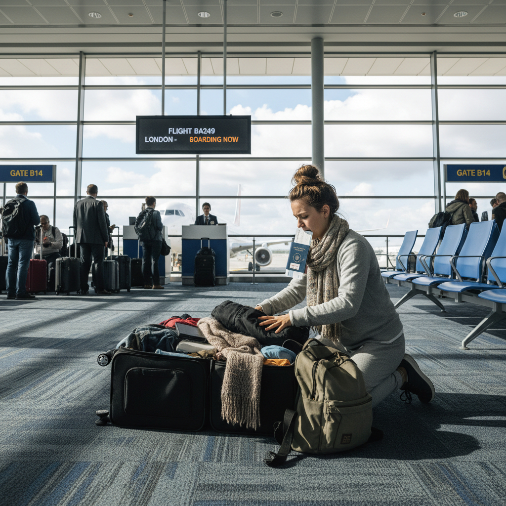 To moment, w którym ryzyko zamienia się w koszt. Najlepsza taktyka to szybkie odchudzenie/kompresja: wyjmij jedną warstwę ubrań, przenieś ciężkie elementy do torby osobistej (jeśli dozwolone), użyj worka na „szybkie przepakowanie”. Unikaj kłótni — ona nie zmienia wymiarów. Zmieniaj bryłę.
