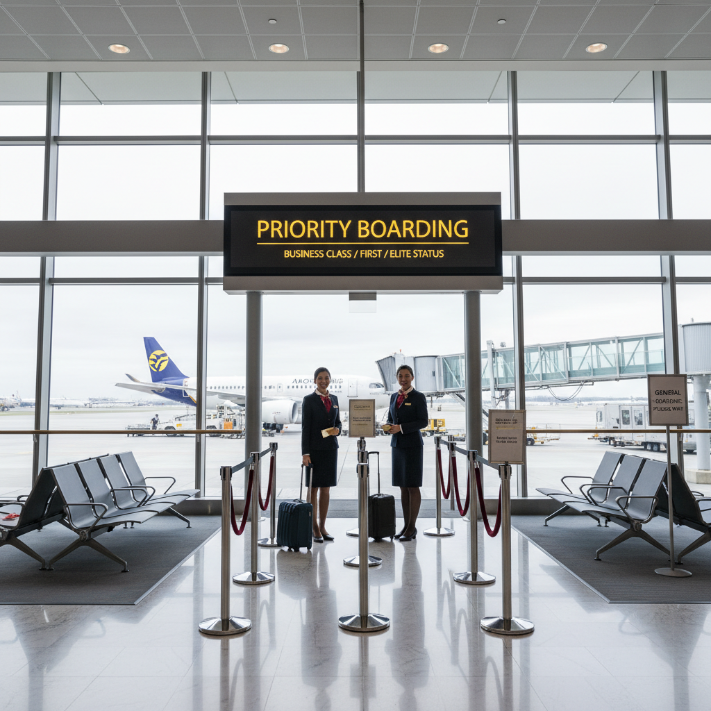 Numerowana grupa pasażerów wskazująca kolejność wejścia na pokład. W tanich liniach priority boarding oznacza grupę „1”, w regularnych przewoźnikach — klasy biznes, statusy lojalnościowe lub osobny pas wejścia.